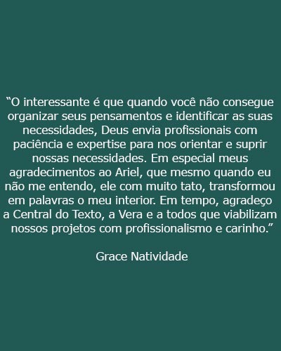 "O interessante é que quando você não consegue organizar seus pensamentos e identificar as suas necessidades, Deus envia profissionais com paciência e expertise para nos orientar e suprir nossas necessidades. Em especial meus agradecimentos ao Ariel, que mesmo quando eu não me entendo, ele com muito tato, transformou em palavras o meu interior. Em tempo, agradeço a Central do Texto, a Vera e a todos que viabilizam nossos projetos com profissionalismo e carinho."