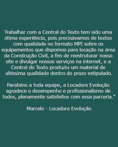 Trabalhar com a Central do Texto tem sido uma ótima experiência, pois precisávamos de textos com qualidade no formato MPI sobre os equipamentos que dispomos para locação na área da Construção Civil, a fim de reestruturar nosso site e divulgar nossos serviços na internet, e a Central do Texto produziu um material de altíssima qualidade dentro do prazo estipulado.