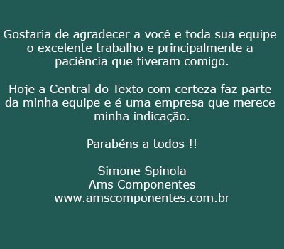 Meus parabéns e indico a Central do texto a qualquer empresa que estiver com dificuldade de colocar em pratica suas ideias e fazer da sua empresa mais aberta ao público através da Central do texto, uma empresa com atendimento "ótimo" e que só tem a crescer.