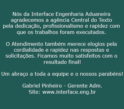 Nós da Interface Engenharia Aduaneira agradecemos a agência Central do Texto pela dedicação, profissionalismo e rapidez com que os trabalhos foram executados. O Atendimento também merece elogios pela cordialidade e rapidez nas respostas e solicitações. Ficamos muito satisfeitos com o resultado final!