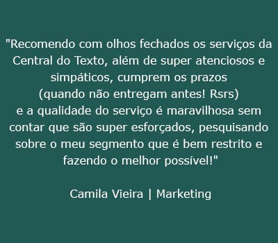 "Recomendo com olhos fechados os serviços da Central do Texto, além de super atenciosos e simpáticos, cumprem os prazos (quando não entregam antes! Rsrs) e a qualidade do serviço é maravilhosa… sem contar que são super esforçados, pesquisando sobre o meu segmento que é bem restrito e fazendo o melhor possível!"