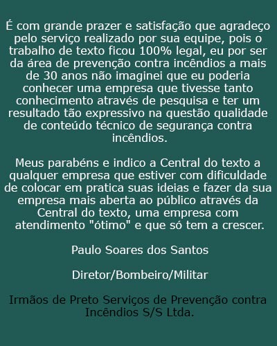 É com grande prazer e satisfação que agradeço pelo serviço realizado por sua equipe, pois o trabalho de texto ficou 100% legal, eu por ser da área de prevenção contra incêndios a mais de 30 anos não imaginei que eu poderia conhecer uma empresa que tivesse tanto conhecimento através de pesquisa e ter um resultado tão expressivo na questão qualidade de conteúdo técnico de segurança contra incêndios.