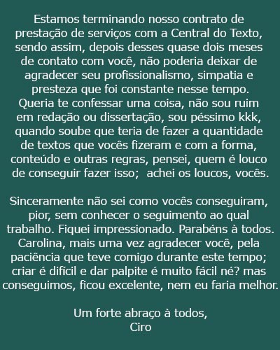 Estamos terminando nosso contrato de prestação de serviços com a Central do Texto, sendo assim, depois desses quase dois meses de contato com você, não poderia deixar de agradecer seu profissionalismo, simpatia e presteza que foi constante nesse tempo.